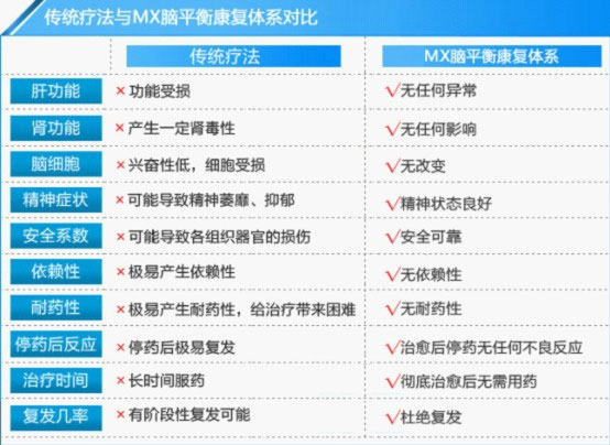 中西药物使用标准:“MX脑平衡康复体系”针对中西药的弊端提出了系统化的解决方案。以西药快速缓解主要疾病症状,再配合由名贵中药中萃取的神经细胞激活物质,恢复受损脑神经细胞的正常生理功能,达到长期平衡患者体内分泌紊乱的神经递质的效果;